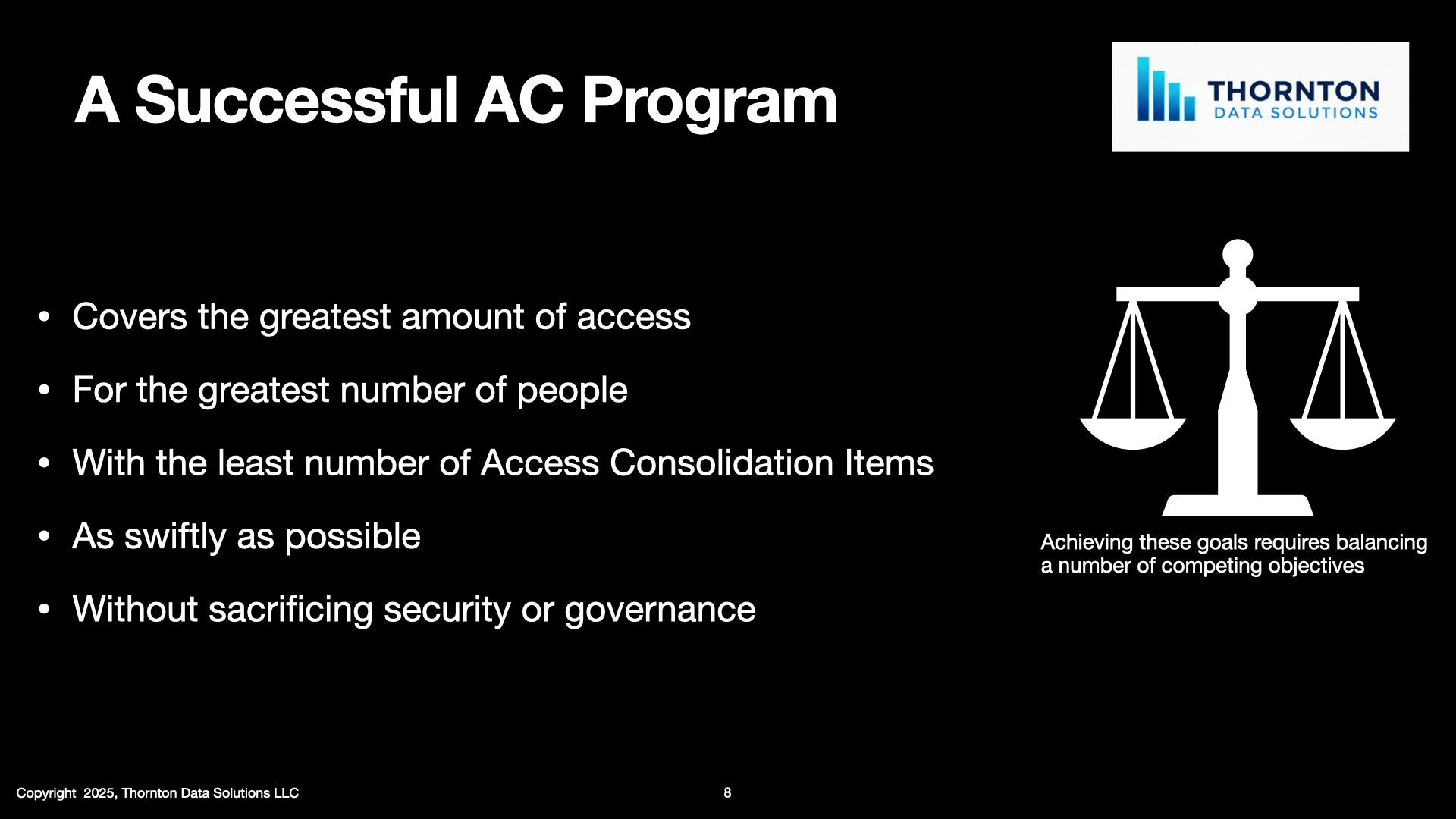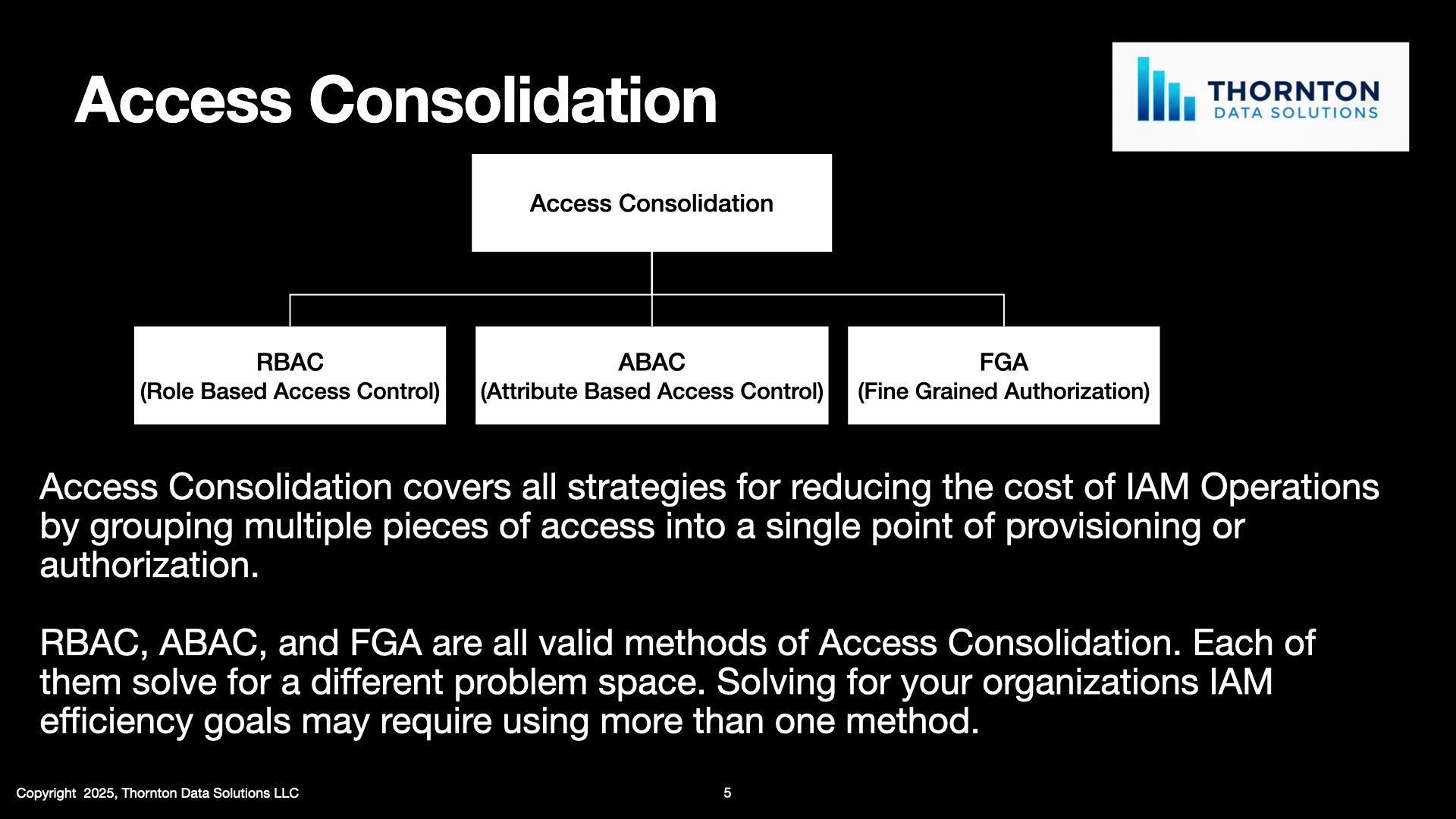 Balancing these at times opposed objectives in order to achieve optimal outcomes requires a skillset and toolset that comes from the experience of leading multiple Access Consolidation Program. At Thornton Data Solutions we've lead over 25 (and counting) Access Consolidation Projects across industry verticals such as Banking, Healthcare, Insurance, Retail and Industrial. If your organization is ready to take the next step and reduce the costs of its IAM operations reach out to us to schedule a no cost initial consultation to figure out if an Access Consolidation Program is right for you.